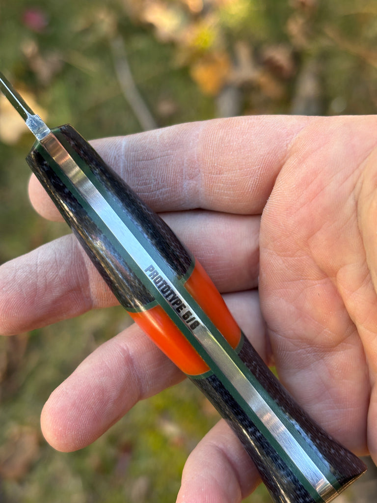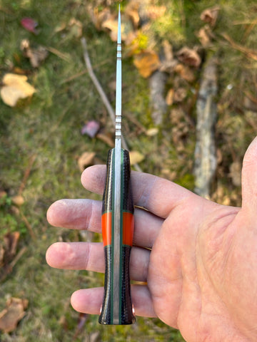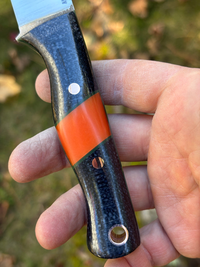 Steel is CPM 4V brought to 64-65 hrc. Scales are black jute with orange butterscotch paper spacer with forest green g10 accents and liners with copper hardware.