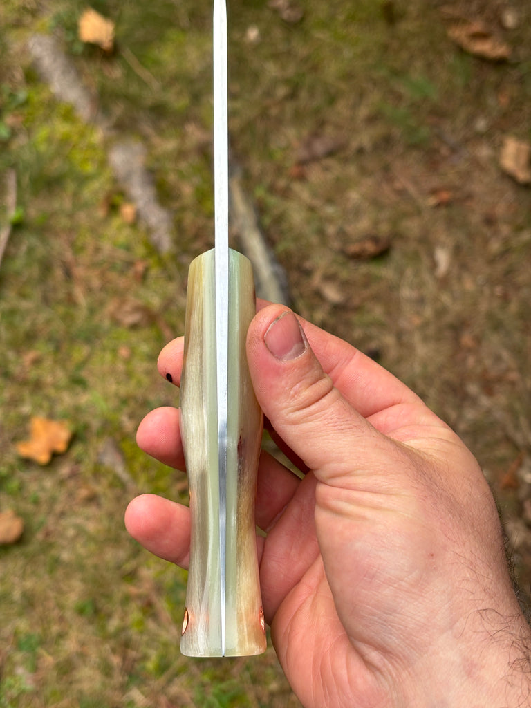 Steel: 1/8th CPM CRU-Wear 63 hrc with tapered tang