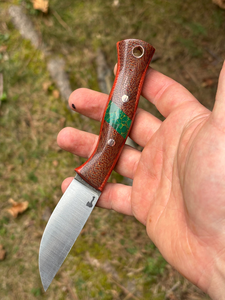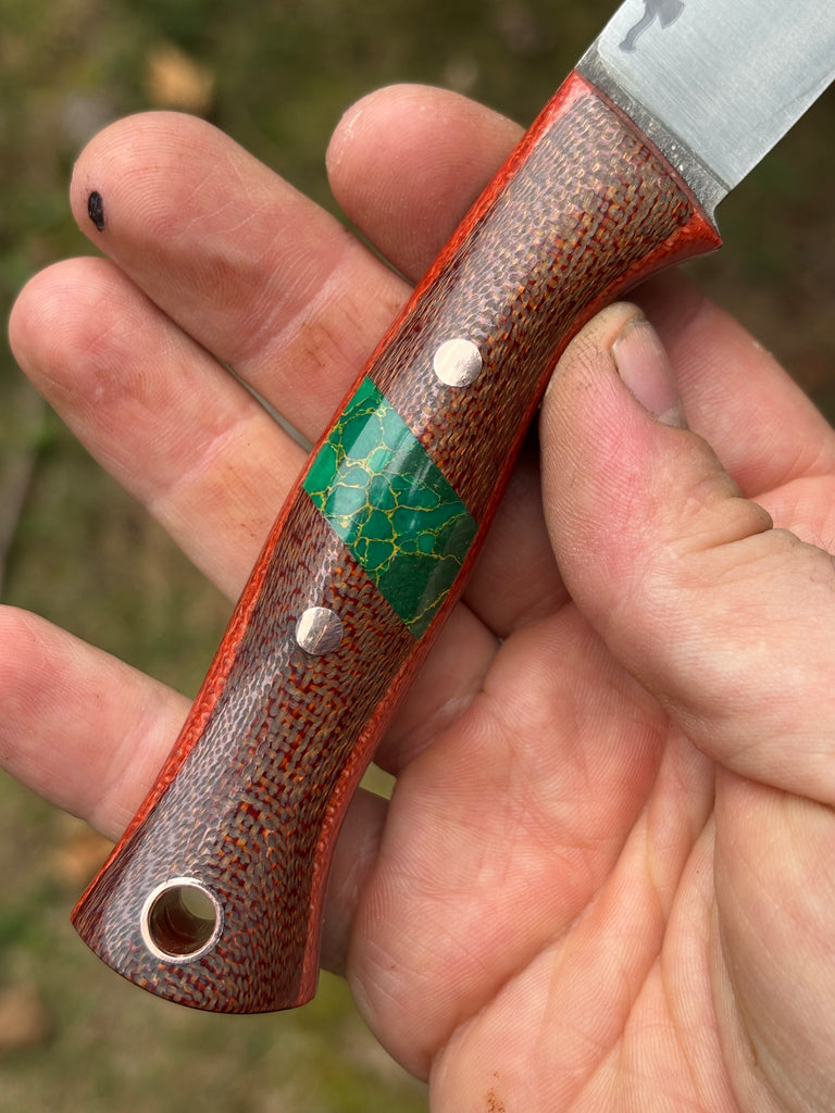 Handle: vintage brown glass composite with green trustone spacer and thick burnt orange liner