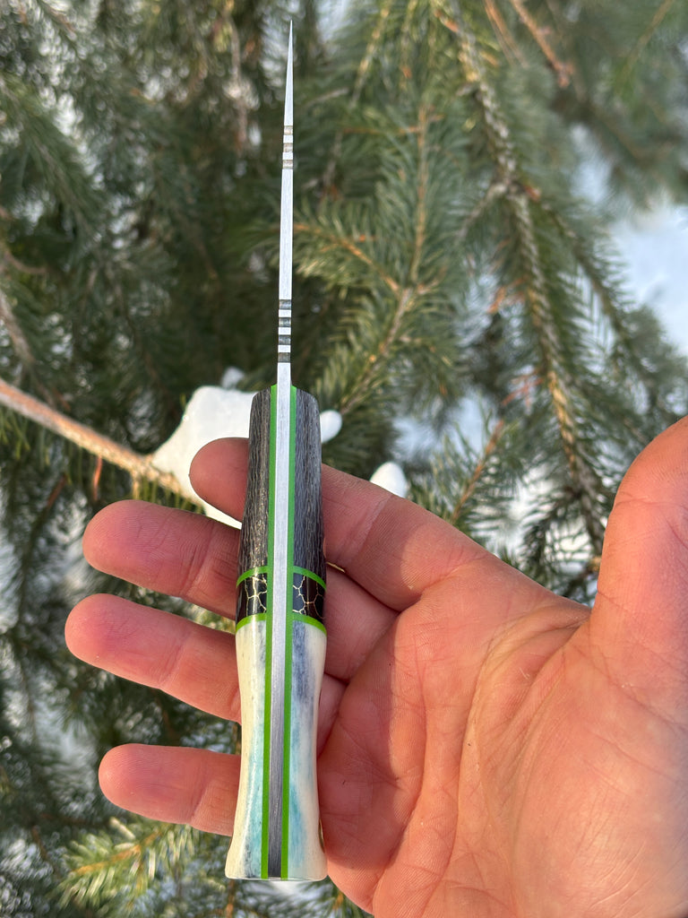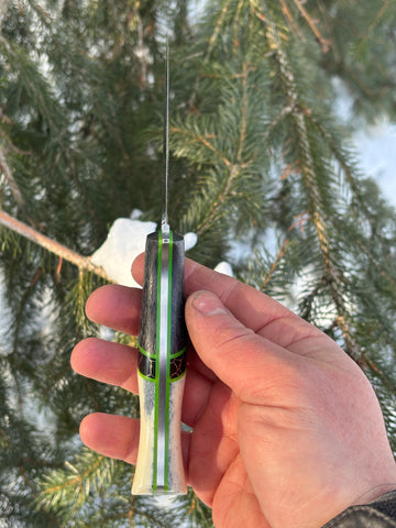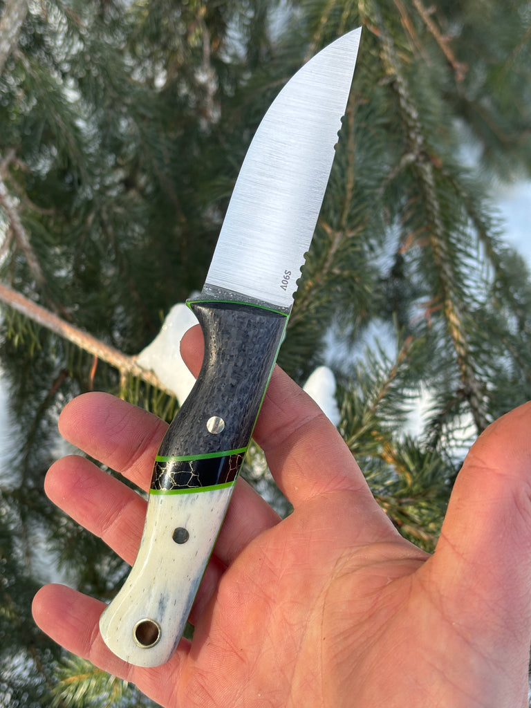 Scales are rubberized carbon fiber with dayglow and trustone spacer finished off with giraffe bone on day glow liners and brass hardware.